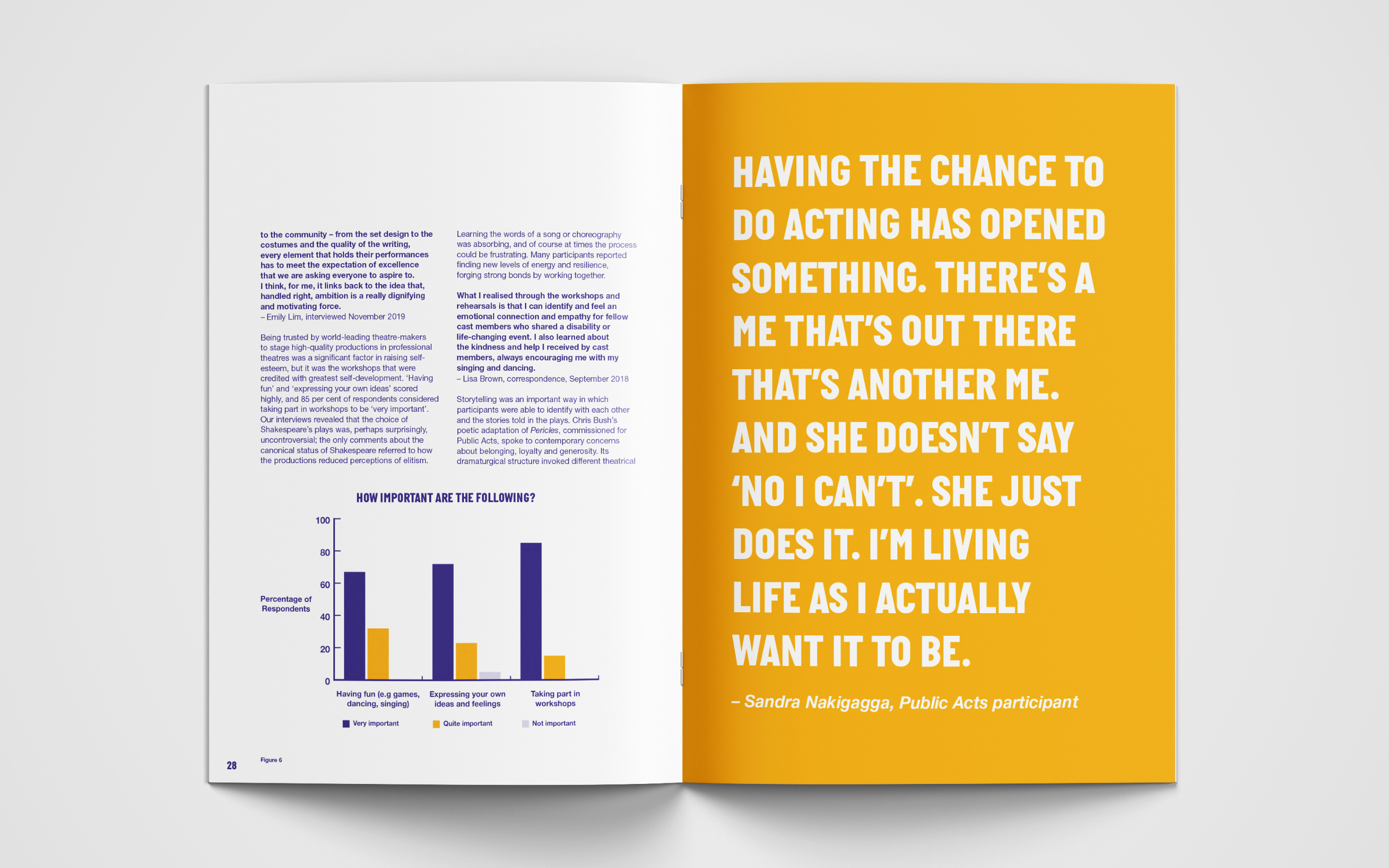 The National Theatre's Learning Department were looking for a print and digital report following the success of their Public Acts programme, which would then be distributed among their partners and participants. I wanted to prioritise clarity and legibility while simultaneously communicating the special energy of the project itself. By interspersing text with treated close ups and cut outs I hoped to instil some of the vigour and vibrancy of the productions into the report.